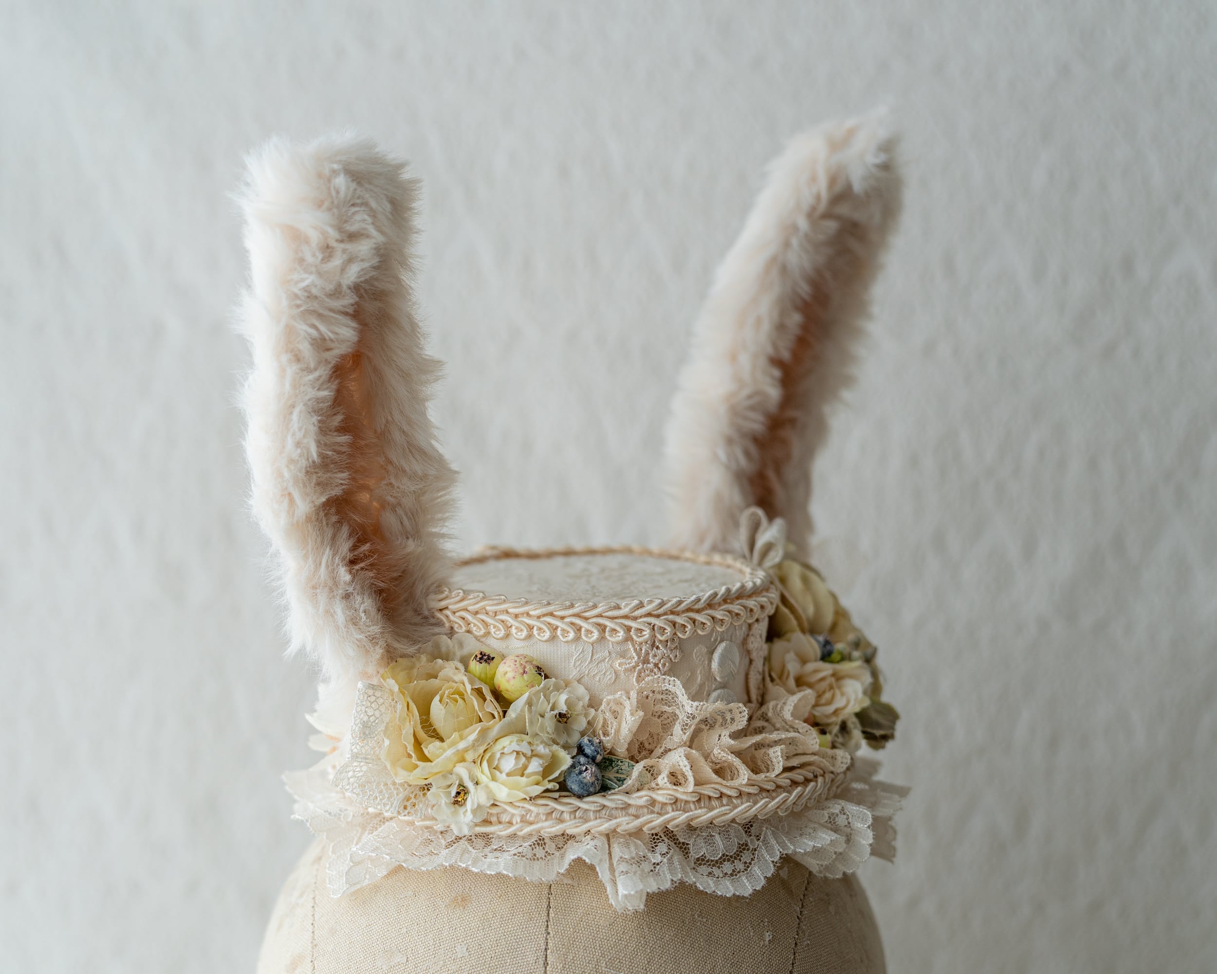 こだわりのお花をコラージュしたうさぎ耳ハットです。