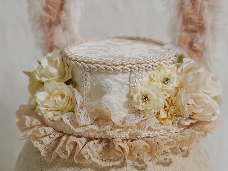 紅茶染めしたレースとお花をたっぷり詰め合わせたうさぎ耳ハットになります。