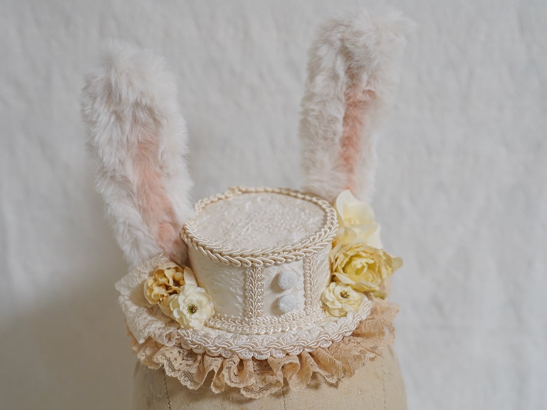 紅茶染めしたレースにお花を詰め合わせたアンティーク色のうさぎ耳ハットです。